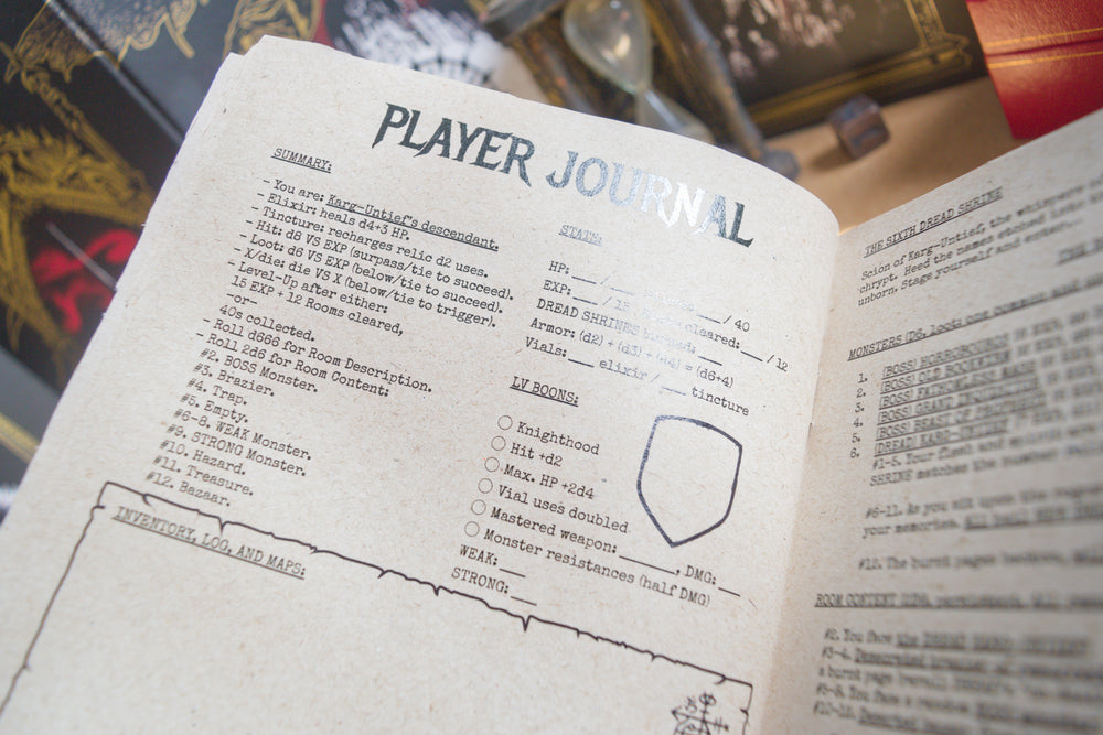 DREAD SHRINES is a solo journaling, pen-and-paper, roguelike dungeon crawler inspired by games like Pelle Nilsson's DARK FORT, FromSoft's Dark Souls, ChAIR Entertainment's Infinity Blade, among others.